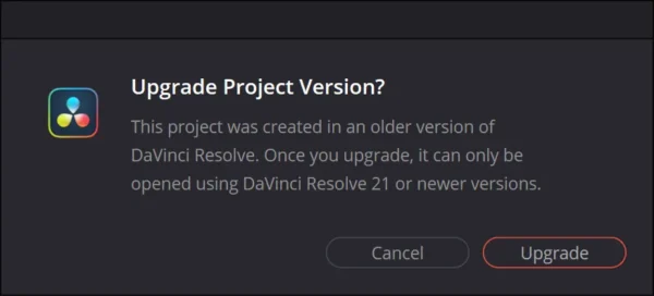 Jos olet aikeissa päivittää DaVinci Resolven, kannattaa varmuuskopioida joko koko projektikirjastosi tai vähintäänkin tärkeimmät yksittäiset projektit ennen ohjelman päivitystä. Tämä siksi, että että kun avaat myöhemmin projektin uudella versiolla, vanhemmalla versiolla aloitettu projekti täytyy muuntaa uuteen ohelmaversioon sopivaksi eikä tätä voi myöhemmin enää peruuttaa tai muuntaa takaisin. Huomaa myös, että et voi avata vanhemmalla DaVinci Resolvella sellaisia projekteja, jotka on luotu uudemmalla vesiolla.